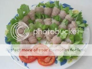 3.ใส่น้ำลงในหม้อ ตั้งไฟให้น้ำร้อน แล้วปั้นลูกชิ้นเป็นก้อนกลมๆ ใส่ลงไปลวกในหม้อ พอสุกลอยให้ตักขึ้นแช่น้ำเย็นจัดๆทันที ตักขึ้นพักไว้ให้สะเด็ดน้ำ